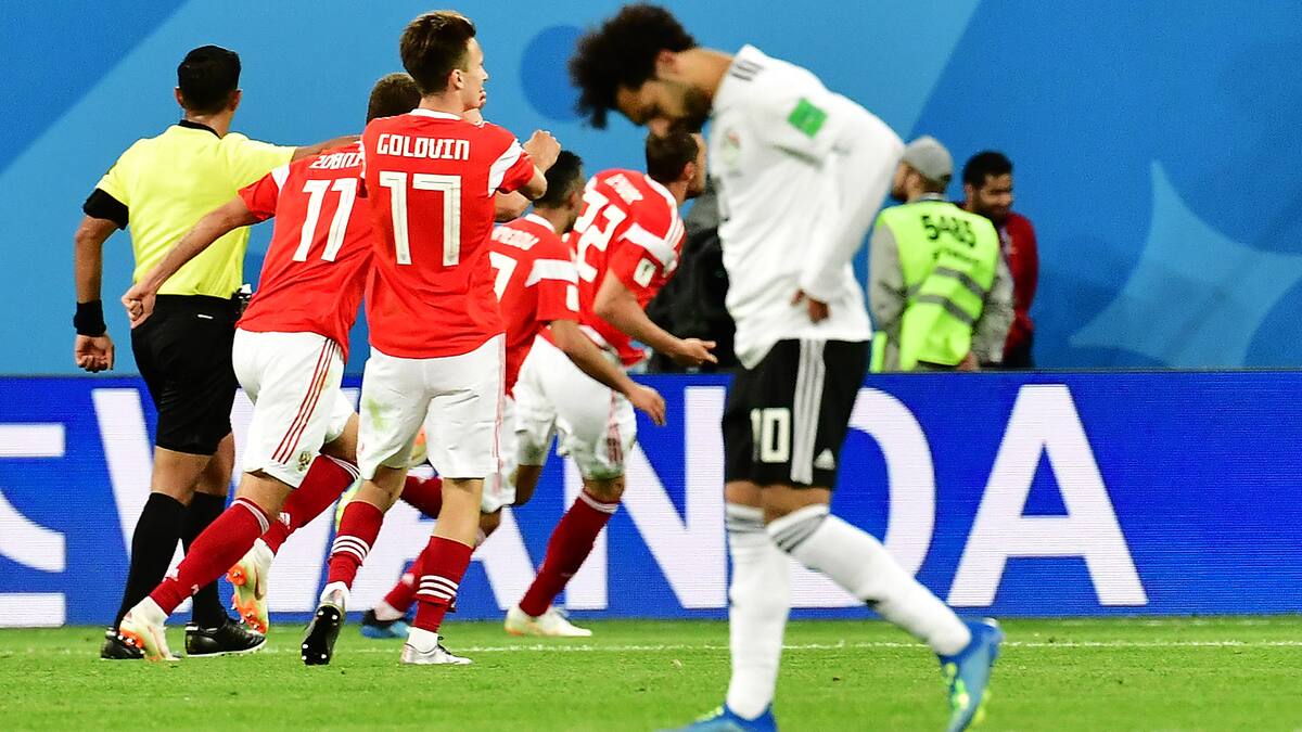 Ahmed Fathy en contra a los 47 minutos, Cheryshev a los 59 y Artem Dzyuba a los 62 marcaron los goles de Rusia. Mohamed Salah de penal a los 73 minutos descontó para Egipto, que prácticamente dijo adiós al torneo.