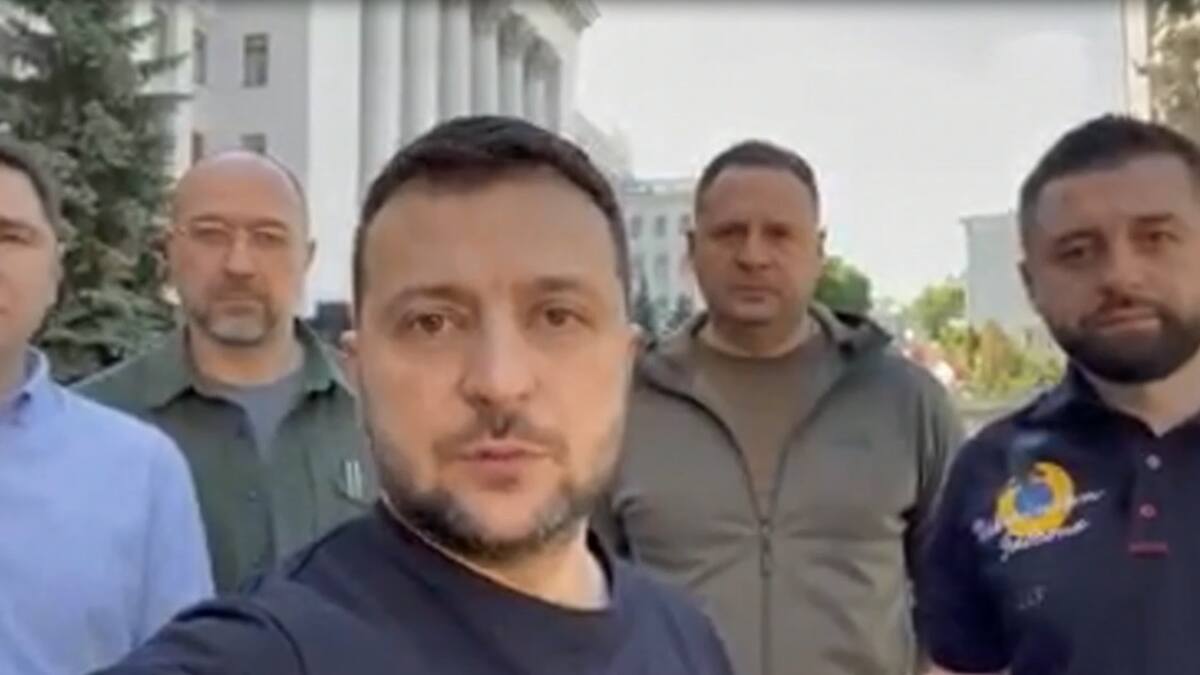 El primer ministro, Denis Shmigalia, y el jefe de la Oficina del Presidente de Ucrania, Andriy Yermak, son algunos de los que aparecen junto a Zelenski en esta grabación en la que afirma que, tras defender a Ucrania durante cien días, la lucha continúa en busca de la victoria.