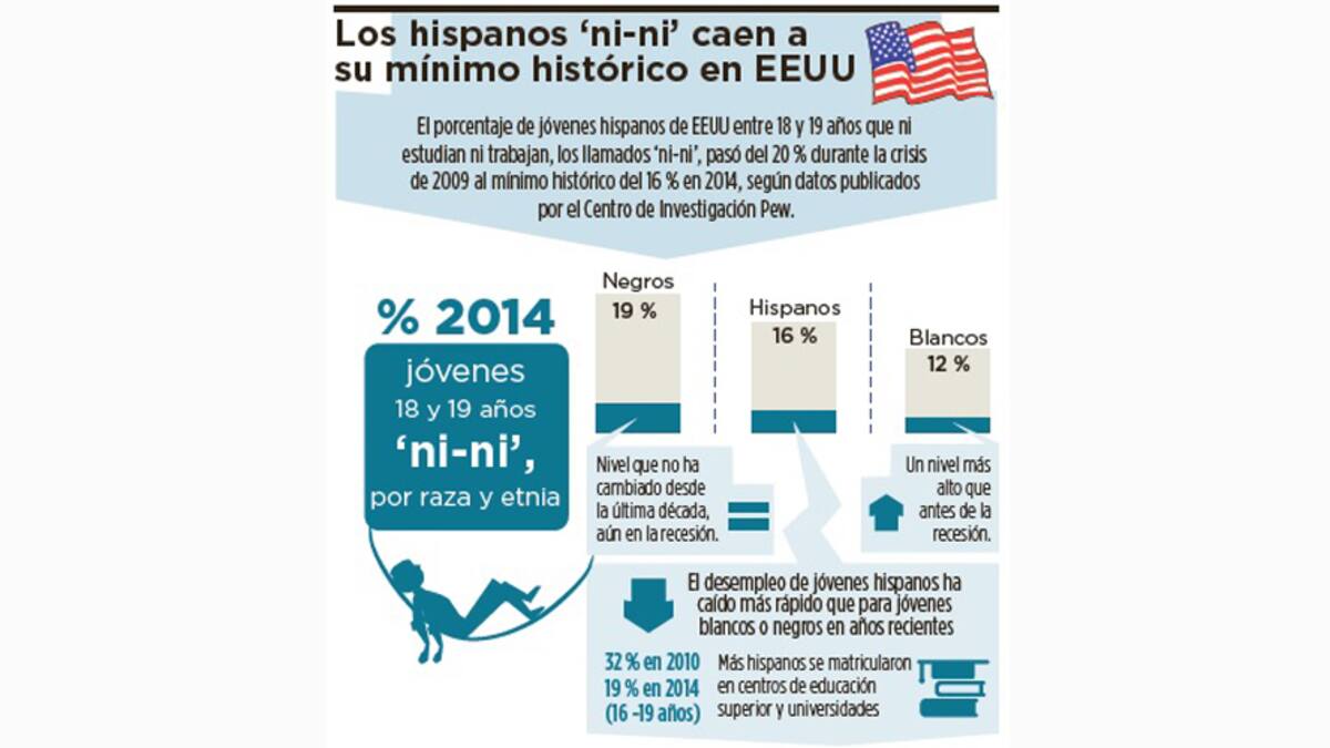 El porcentaje de jóvenes hispanos de Estados Unidos entre 18 y 19 años que ni estudian ni trabajan, los llamados ‘ni-ni’, ha pasado del 20% durante la crisis de 2009 al mínimo histórico del 16% en 2014, según datos publicados por el Centro de Estudios Pew.