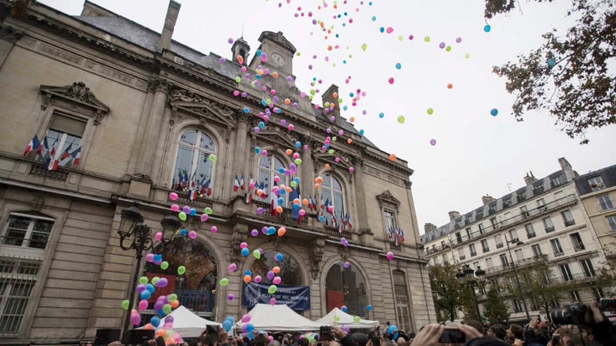 En un acto posterior abierto al público -las ceremonias oficiales estuvieron rodeadas de un férreo dispositivo de seguridad que mantenía a los curiosos a decenas de metros-, se organizó ante el Ayuntamiento del distrito XI de París una suelta de globos de colores como símbolo del carácter diverso de las víctimas.