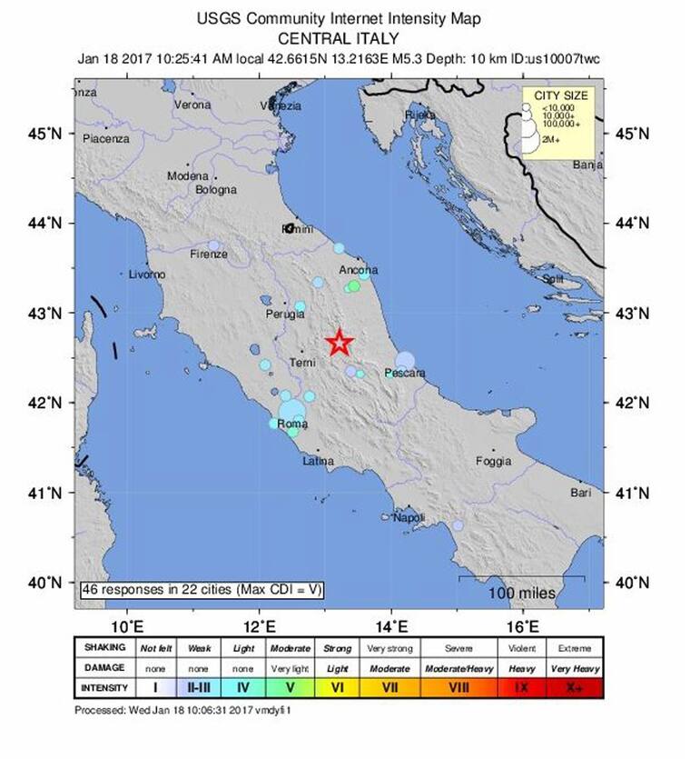 USGS / HANDOUT/EFEFotografía facilitada por la Agencia de Supervisión Geológica de EE.UU. (USGS) del lugar donde se registró un terremoto de magnitud 5.3 a 104 kilómetros al noreste de Roma (Italia).
