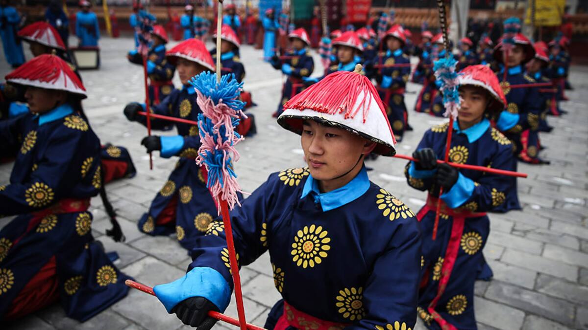 Cerca de allí, en el Templo de la Tierra, se organizó una ofrenda a imitación de las que los emperadores hicieron allí durante siglos con el comienzo del año: actores disfrazados de soldados de la dinastía Qing escoltaron a otro encarnado en emperador amarillo, que encendió incienso y se arrodilló en un gran altar de plegarias.
