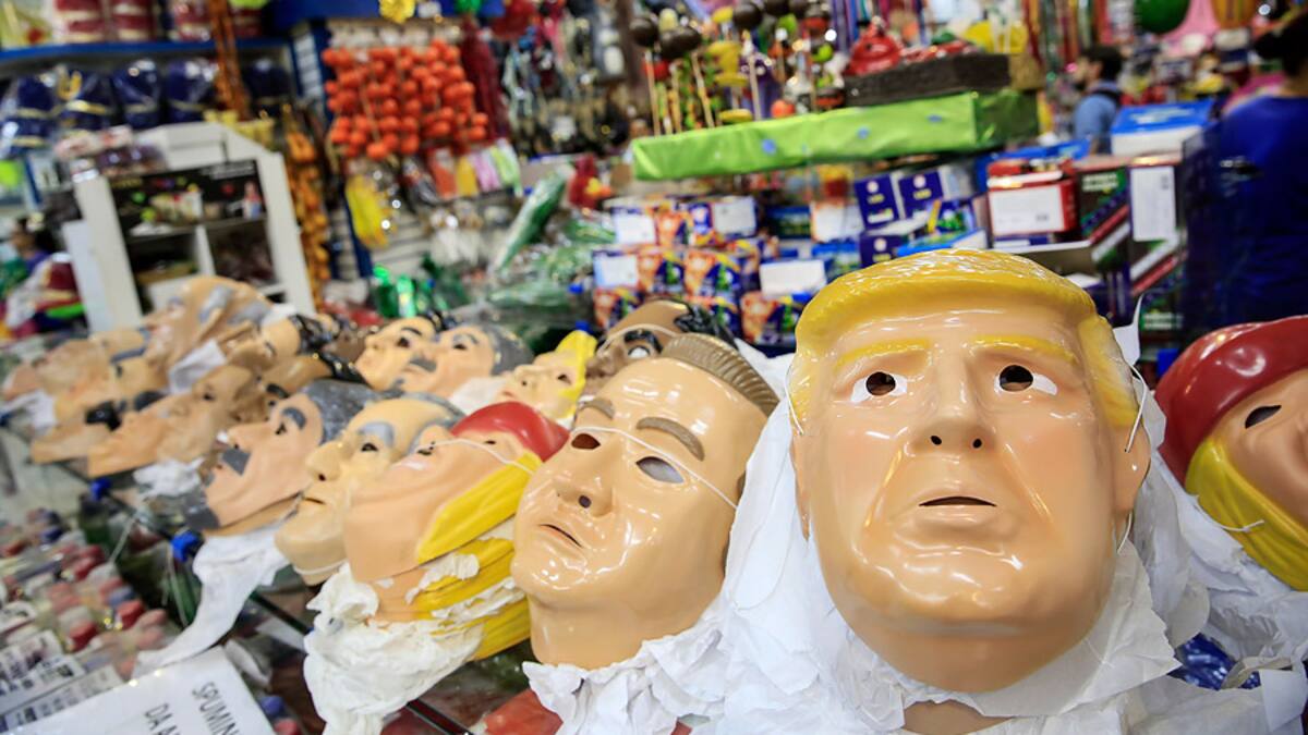 De cabello rubio y tez anaranjada, la máscara de Trump ocupa un espacio privilegiado en la vitrina de una enorme tienda repleta de disfraces, al lado de otros importantes políticos, como su antecesor, Barack Obama, o el expresidente brasileño Luiz Inácio Lula da Silva.