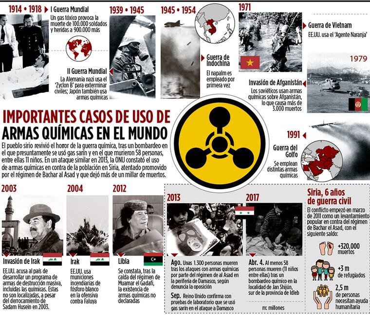 En agosto de 2013, el régimen fue acusado de haber empleado gas sarín en un ataque contra dos sectores rebeldes en la periferia de Damasco que dejó más de 1.400 muertos, según Estados Unidos. El gobierno rechazó las acusaciones y ratificó en 2013 la Convención sobre la prohibición de armas químicas. Siria debería haber destruido su arsenal químico en virtud de un acuerdo entre Moscú y Washington, pero se sospecha que el régimen ha vuelto a utilizar este tipo de armamento en varias ocasiones. En octubre de 2016, el Consejo de Seguridad recibió un informe concluyendo que el ejército sirio había llevado a cabo algunos de estos ataques con cloro, en 2014 y 2015. A principios de marzo, la Organización para la Prohibición de las Armas Químicas (OIAC) indicó que investigaba otros ocho ataques con gas tóxico cometidos en Siria desde principios de 2017. El régimen y Rusia han acusado siempre a los grupos rebeldes armados o a los yihadistas de emplear armas químicas.