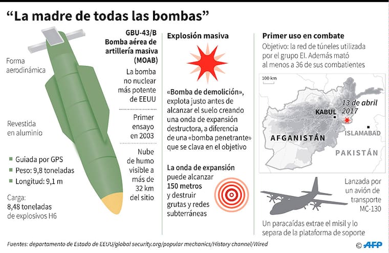 El presidente estadounidense, Donald Trump, dijo que dio 'total autorización' a las Fuerzas Armadas para utilizar, por primera vez y en zona de combate, la GBU-43, una bomba de 10 toneladas que es el proyectil no nuclear más grande y potente del arsenal estadounidense.
