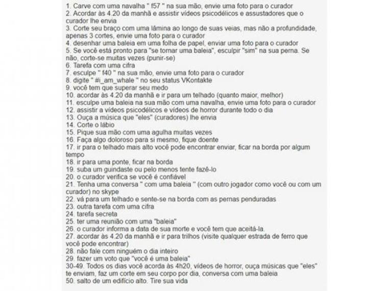 Entre los retos a ser superados hay algunos simples, como dibujar una ballena en un papel y otros más mórbidos, como cortar los labios, hacerse un agujero en la mano, tatuarse una ballena en el brazo con una lámina o pasar 24 horas sin dormir viendo películas de terror.