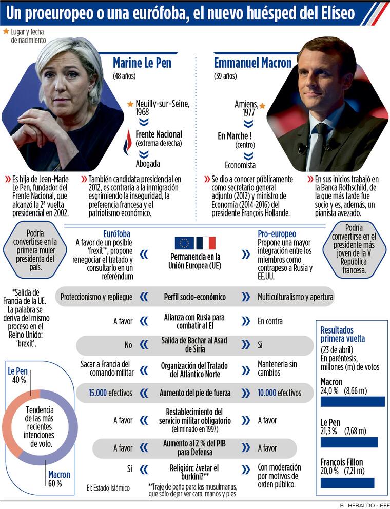 En cambio, Macron –al que los sondeos le pronostican una victoria hoy con el 60% de los votos– quiere dotar a la zona euro de un presupuesto, un parlamento y un ministro de Financias propios, comprometerse con una 'política de inversiones europeas' y reforzar la defensa de Europa.
