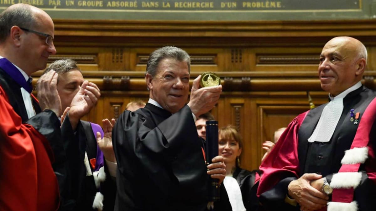En una solemne ceremonia en el Gran Anfiteatro de la Sorbona, en presencia del ministro de Educación francés, Jean-Michel Blanquer, y de autoridades académicas, Santos recibió este 'preciado' título 'en nombre del pueblo colombiano'.