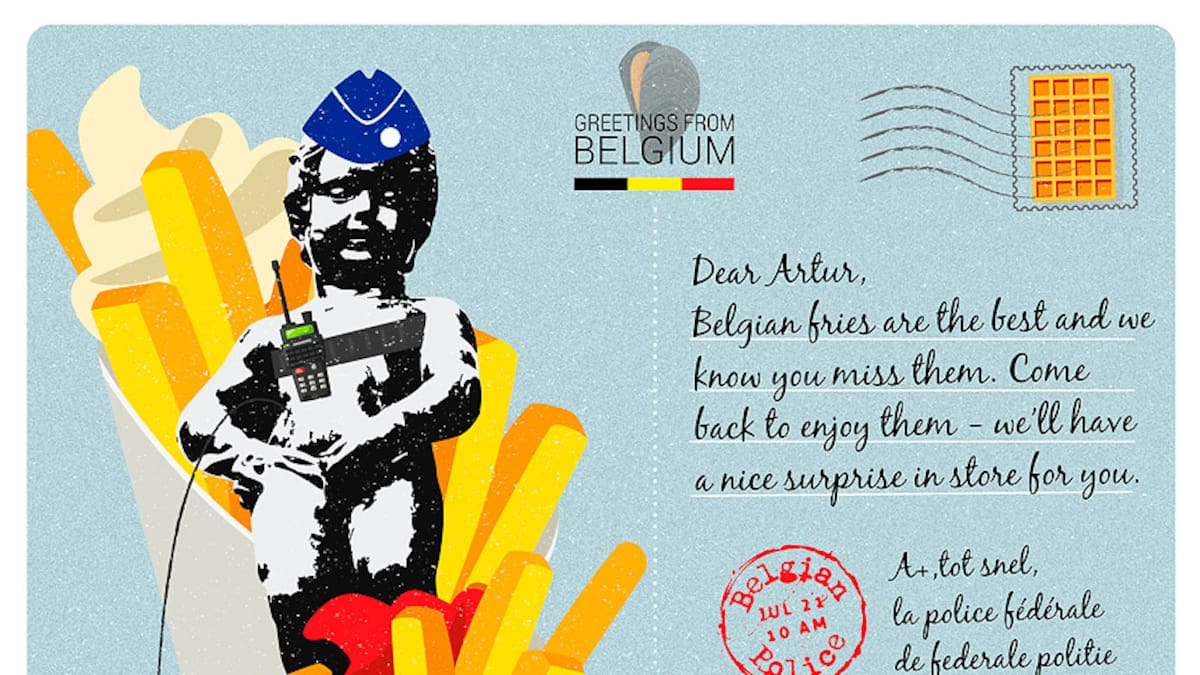'Querido Arturo, las papas fritas belgas son las mejores y sabemos que te hacen falta. Vuelve para apreciarlas, tenemos una sorpresa para ti' menciona la postal de la policía belga, ilustrada con un cucurucho de papas fritas y una cerveza, desvelada este viernes.