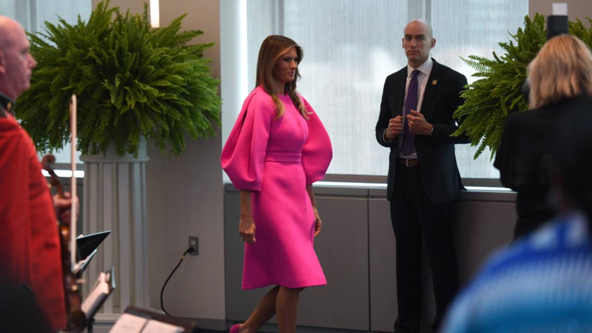 La primera dama estadounidense, Melania Trump, fue blanco de burlas en las redes sociales este miércoles por el vestido fucsia fluorescente de la marca española Delpozo que llevó a un almuerzo con parejas de líderes mundiales en la ONU.