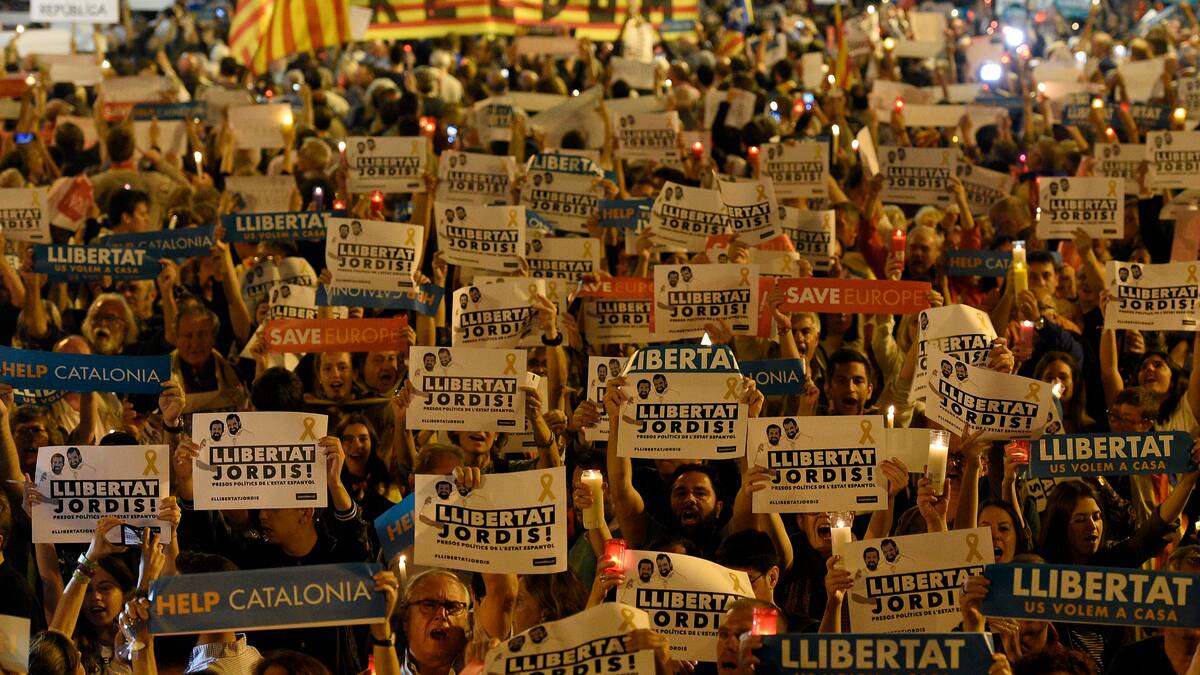 Miles de catalanes salieron a las calles este martes en protesta por el encarcelamiento de dos influyentes líderes independentistas acusados de sedición por la justicia, en medio de una crisis enquistada entre el gobierno regional y el central.