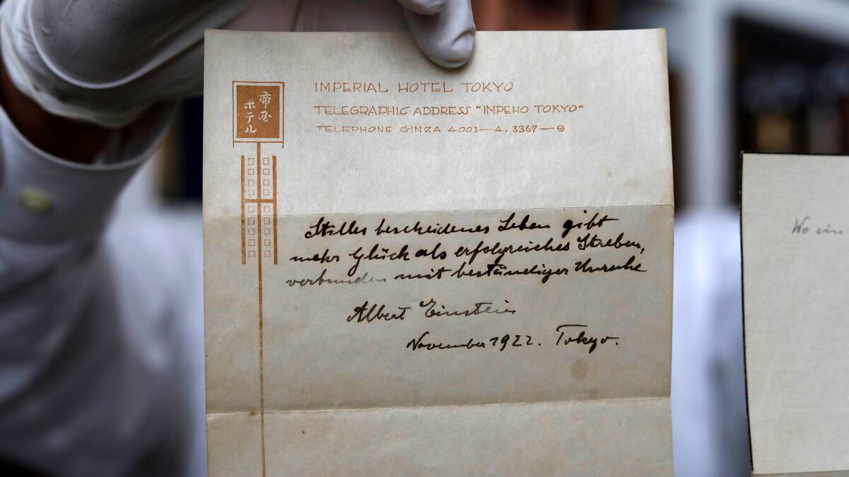 Una nota que Albert Einstein le dio a un mensajero en Tokio porque no tenía monedas para darle propina, en la que explicaba brevemente su teoría para tener una vida feliz, ha salido a luz tras 95 años y será subastada en Jerusalén.