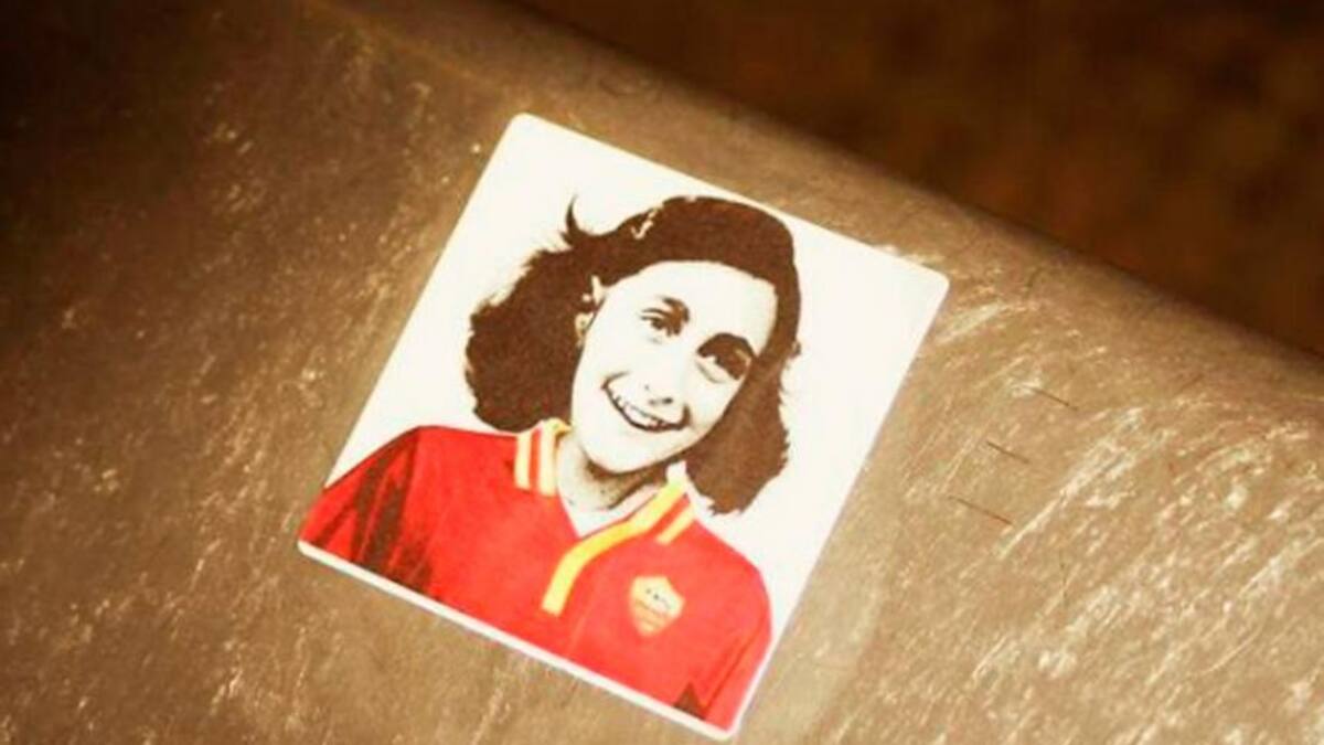 Estos ultras dejaron numerosas pegatinas, especialmente en los baños, mostrando a Ana Frank con la camiseta de la Roma.