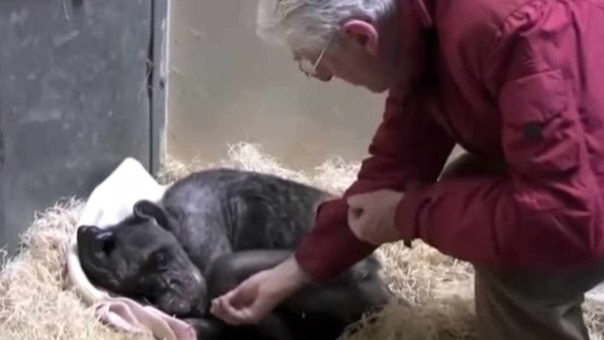 Justo en ese momento de sufrimiento fue donde se percató de uno de los ingresos de Van Hooff al recinto donde se encontraba recostada, aceptándole así un fruto y agradeciendo con varios gestos de cariño.