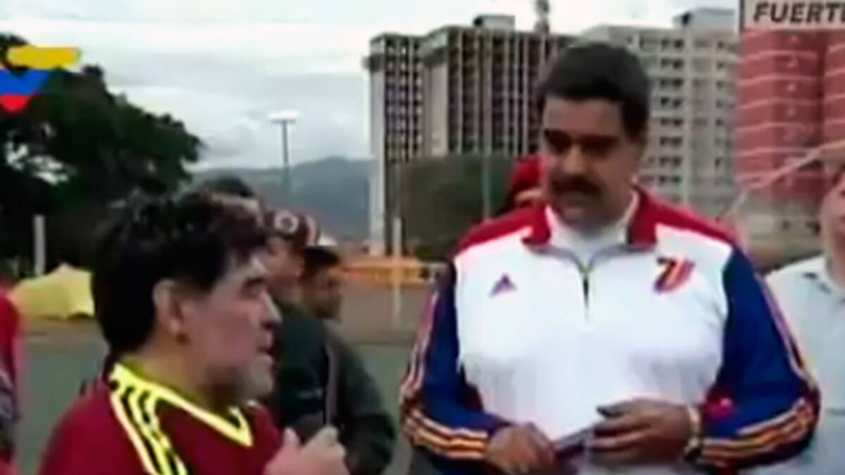 'No aflojes, en fútbol por más que pierdas 3 a 0 no aflojes nunca, y vos no aflojaste nunca y te la jugaste por los venezolanos. ¡Viva Maduro!', exclamó Maradona tras tocar la pelota con el mandatario.