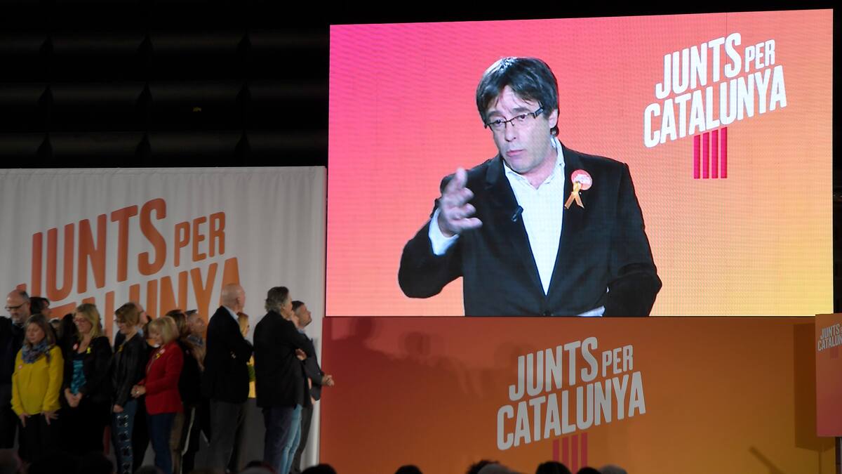 Puigdemont, independentista de centroderecha, intervino por videoconferencia en el mitin inaugural el lunes a medianoche de su candidatura Juntos por Cataluña, que dejó una silla vacía con su nombre en el acto.