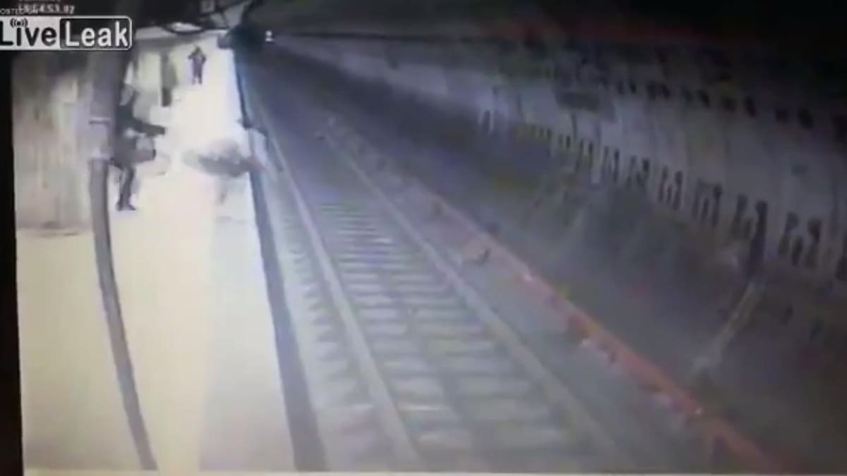 El escalofriante momento en que una mujer es arrojada a las vías del tren en Bucarest