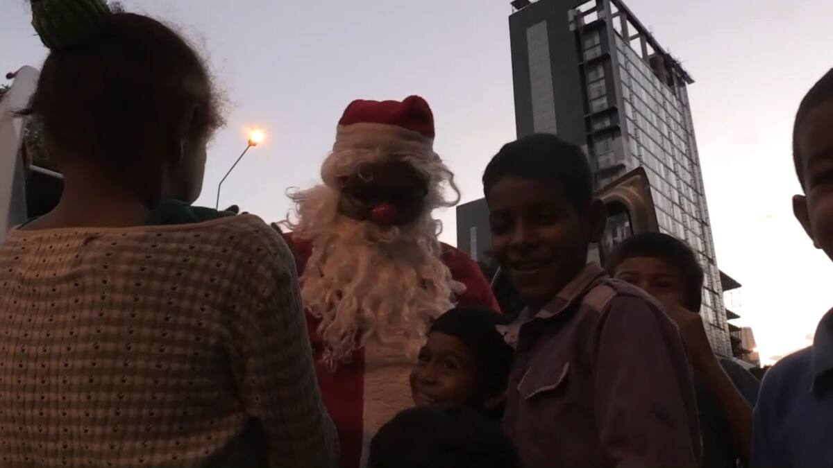 Voluntarios vestidos de Santa Claus recorren las calles de Caracas llevando comida y regalos a los pobres, un destello solidario en una Navidad apagada por la crisis.