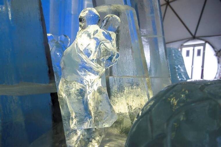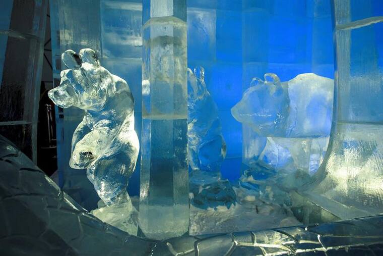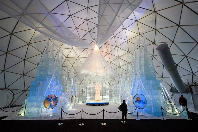 Esculturas de hielo expuestas en la cúpula del complejo de los montes Tatras en Hrebienok (Eslovaquia). Algunas de de las figuras representadas más impresionantes es la de la Sagrada Familia de Barcelona.