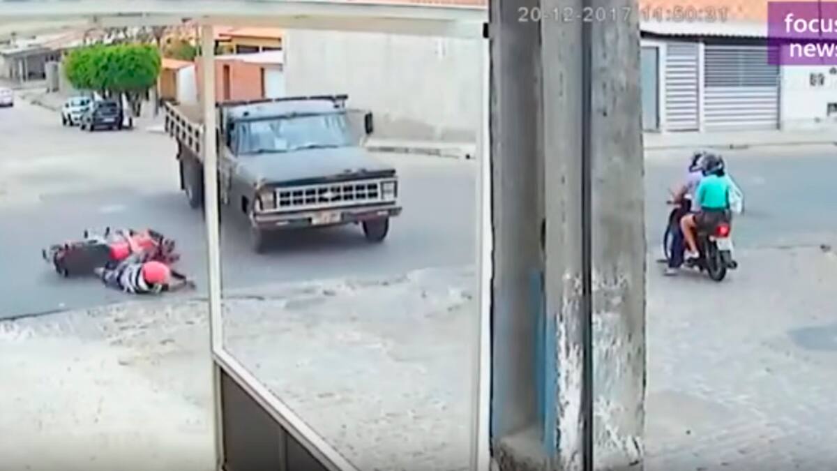Una cámara de seguridad captó el momento en el que un motociclista se salvó milagrosamente de ser aplastado por las llantas de un camión en Campino Grande, Brasil. El hombre fue identificado como Josicleu Rodrigues, de 42 años. Personas que estaban en el lugar se acercaron al automotor para intentar ayudarlo, pero este se levantó y caminó sin niguna ayuda.