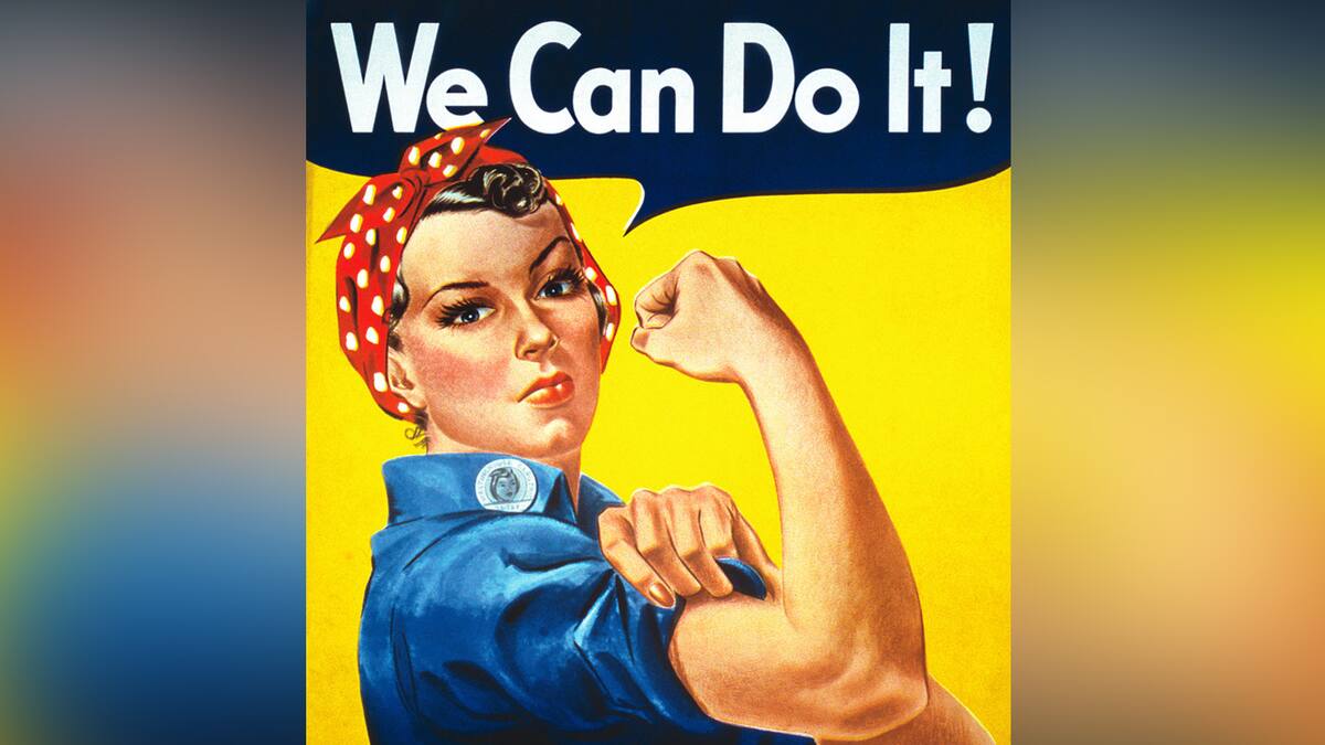 '¡Podemos hacerlo!', reza el cartel de propaganda de la guerra, que en llamativos colores primarios presenta a una joven que muestra sus bíceps con un mono azul de obrera y un distintivo pañuelo de lunares rojo y blanco.