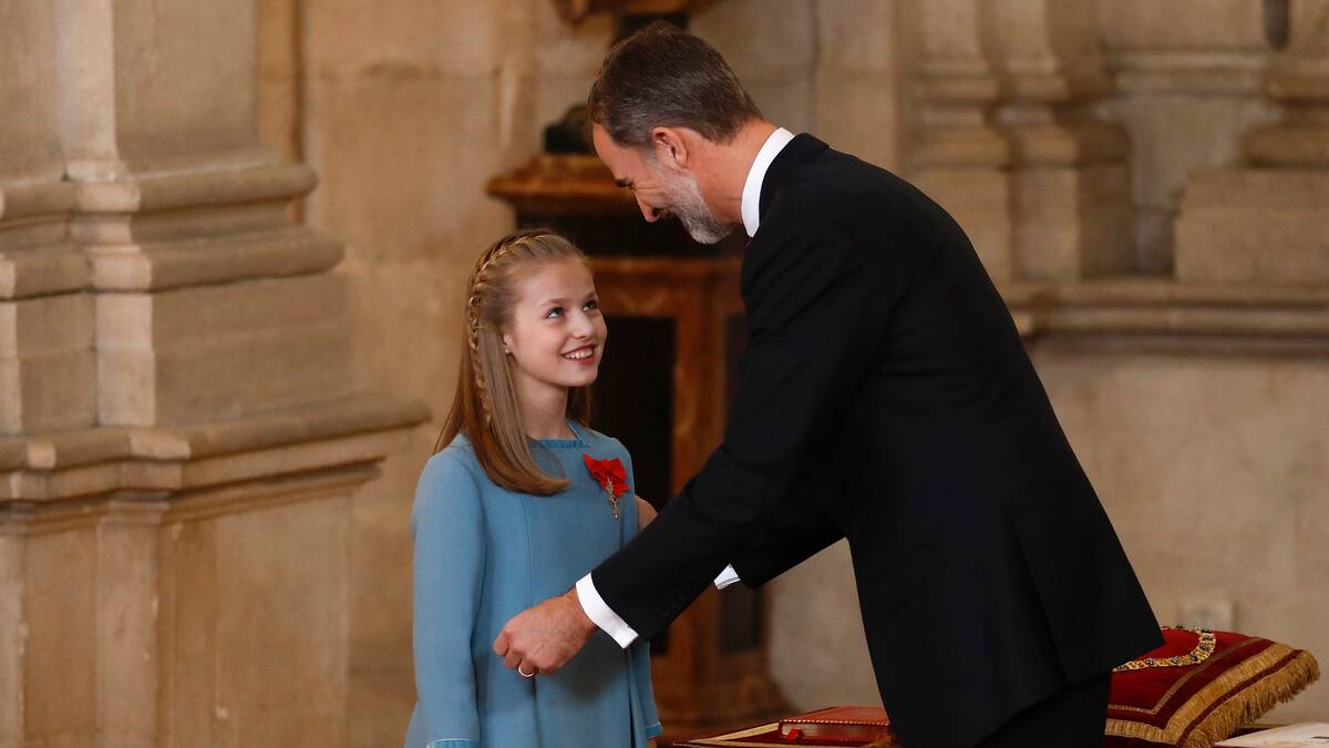 En un acto solemne en Madrid, el monarca impuso una miniatura del Toisón de Oro a su hija, ataviada con un vestido azul cielo. Recibida la insignia con una sonrisa, hizo sucesivas reverencias a su padre, en el trono desde junio de 2014, a su madre la reina Letizia, y a sus abuelos, los reyes eméritos don Juan Carlos I (1975-2014) y doña Sofía.