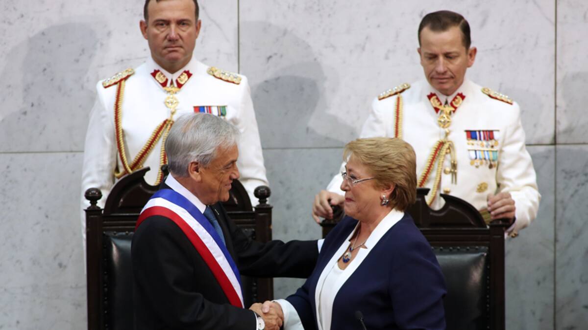 El presidente del Senado, el socialista Carlos Montes, tomó juramento a Piñera y le impuso la banda presidencial de parte de una emocionada Bachelet, quien por segunda vez en los últimos ocho años, ayudó al nuevo mandatario a ceñírsela antes de darle un beso y abandonar el hemiciclo junto a su gobierno.