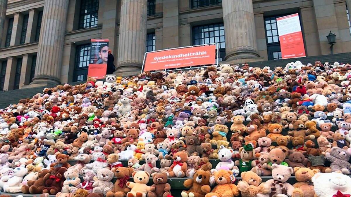 Un total de 740 osos de peluche fueron colocados el jueves en las escalinatas de la Sala de conciertos de Berlín. La iniciativa busca llamar la atención sobre los 740.000 niños sirios desplazados por los siete años de guerra en su país.