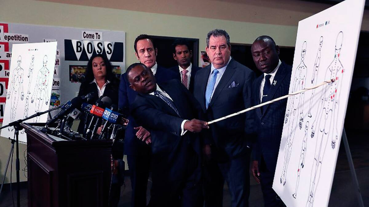 Omalu, reconocido por su trabajo sobre lesiones relacionadas con fútbol americano, mostró en un gráfico dónde había sido cada disparo: uno en el cuello, otro en el muslo y en el costado izquierdo, y el resto en su espalda.