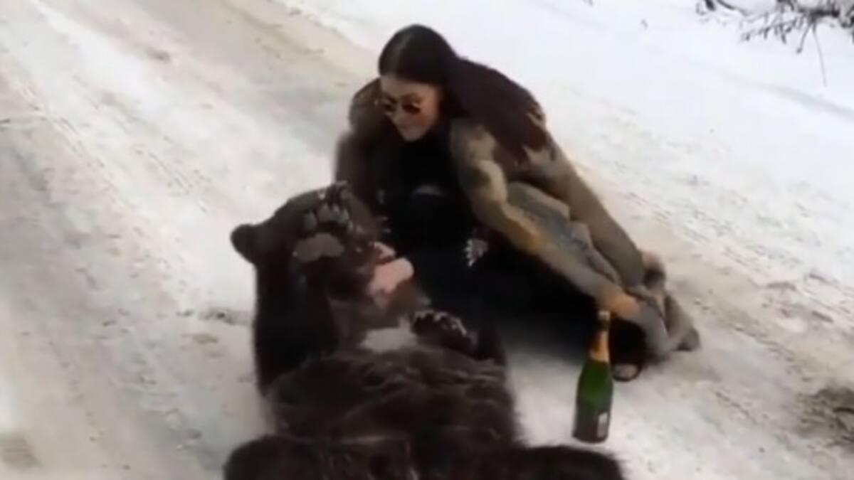 El video de una joven con un abrigo de piel y una botella de champán, acariciando a un oso extrañamente dócil se ha hecho viral en las redes sociales.