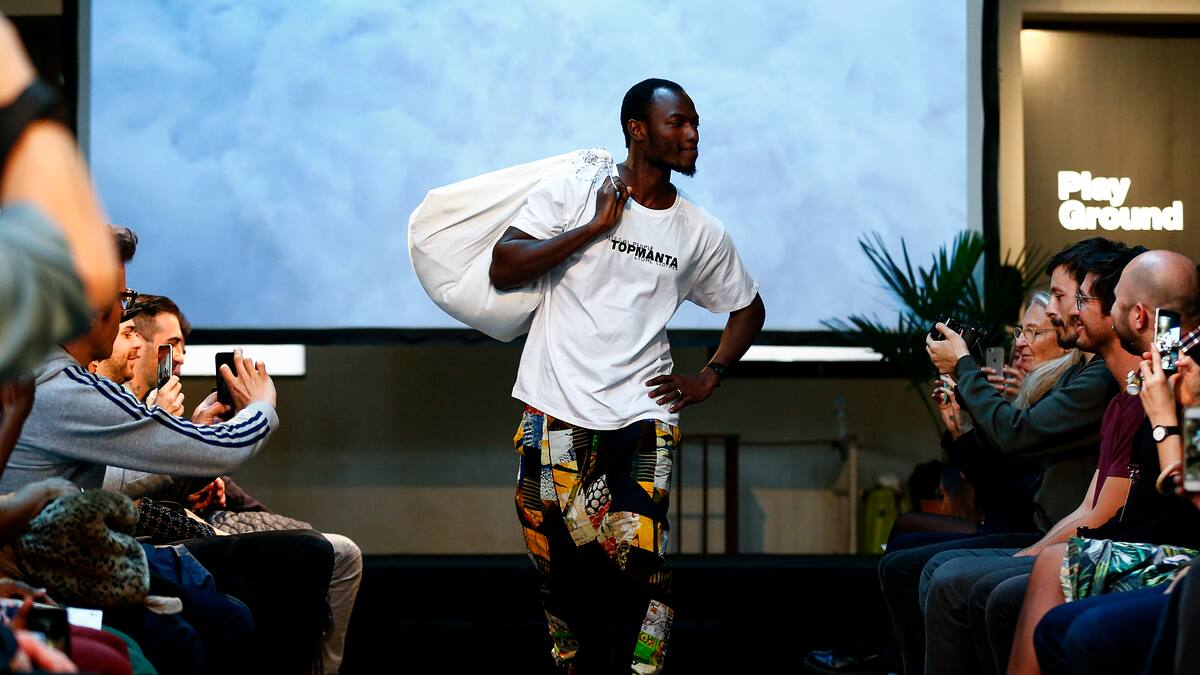 Una quincena de vendedores presentó una pequeña colección de camisetas y ropa, creada en colaboración con el Centro Universitario del Diseño de Barcelona, constató un fotógrafo de la AFP.