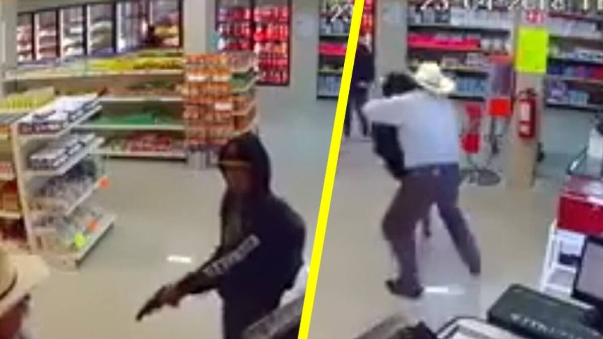 Las cámaras de seguridad de un establecimiento registraron el momento justo en que un hombre con vestimenta similar a la de un vaquero, frustró un intento de hurto por parte de un hombre armado en una carnicería de Monterrey, México.