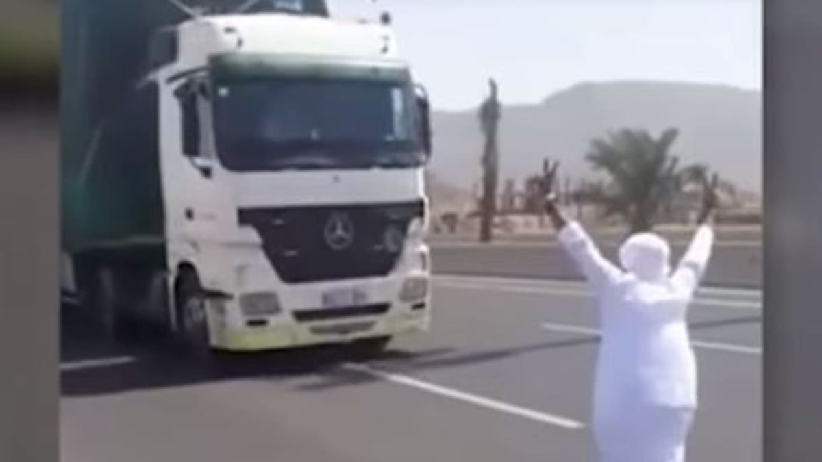 Pasados algunos minutos, el hombre aguarda a que el vehículo de carga pesada esté lo más cerca posible de él para saltar a la carretera y caer justo frente a la tractomula.