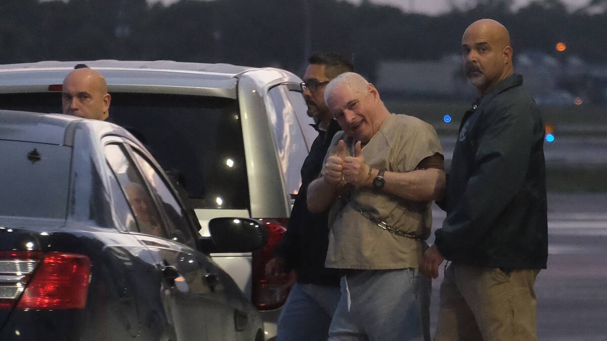 Vestido de beige y esposado de manos, el expresidente bajó del vehículo en el que fue trasladado desde la cárcel al aeropuerto y saludó alegremente a periodistas en el lugar.