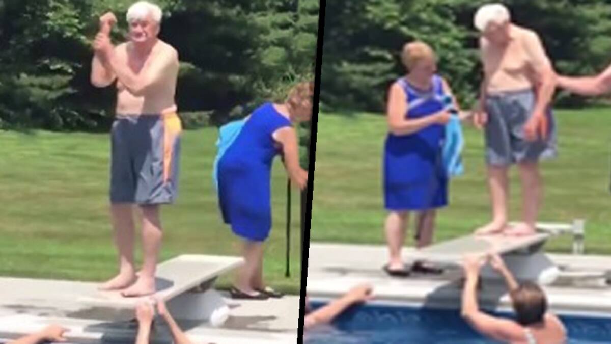 Con ayuda de sus familiares y amigos el hombre se subió con su bastón y caminó hacia el borde para realizar un clavado.