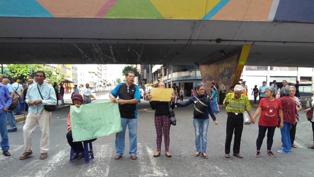 En el centro de Caracas, unos 200 jubilados interrumpieron el tráfico en la concurrida avenida Urdaneta, a escasas cuadras del palacio presidencial de Miraflores.