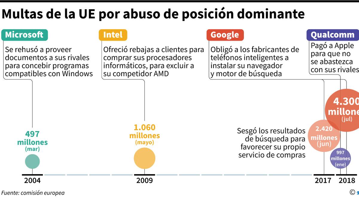 La sanción de 4.342 millones de euros impuesta este miércoles por la Comisión Europea al gigante estadounidense de internet Google es la más voluminosa decidida por abuso de posición dominante, pero no la única.