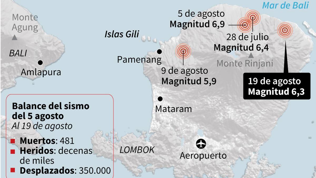Un sismo de magnitud 6,3 sacudió este domingo la isla indonesia de Lombok, semanas después de otro sismo que mató a más de 460 personas, anunció el Servicio Geológico de Estados Unidos (USGS).
