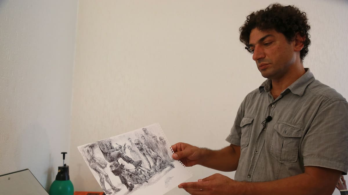 Cuerpos escuálidos, desfigurados por los golpes, miradas ojerosas, manos escondiendo los genitales... Colgados en las paredes de su departamento, estremecedores dibujos con tinta china muestran los abusos que este exprofesor de arte de 49 años vio y vivió.