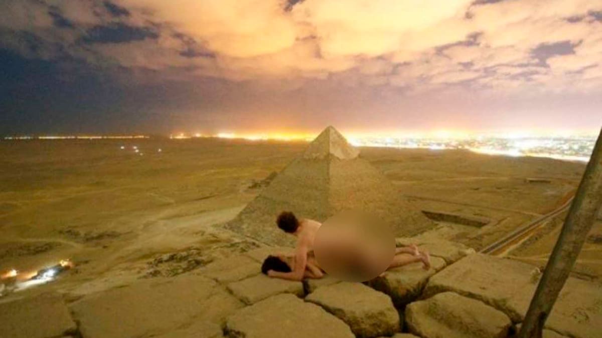 El vídeo muestra a un hombre y una mujer que suben de noche a la pirámide y luego aparecen desnudos en lo alto, uno encima del otro, a primera hora de la mañana.