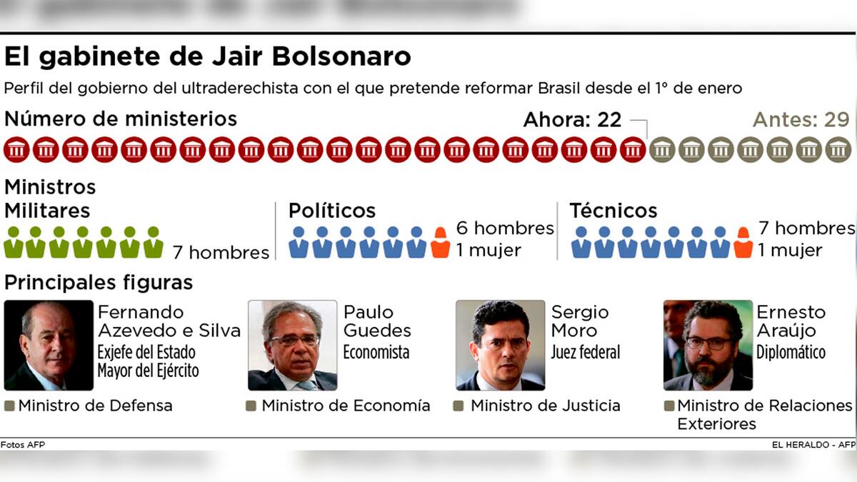 El gabinete del presidente brasileño Jair Bolsonaro, que asumirá el cargo el 1º de enero, tendrá 22 ministros, siete de ellos militares retirados, y contará con solo dos mujeres. En un país con una amplia población afrodescendiente, en la lista no figura ningún negro.