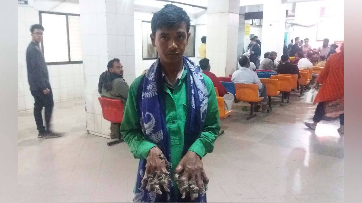 Abul Bajandar ya se sometió a 25 cirugías desde 2016. Las excrecencias le deforman las manos por lo que no las puede utilizar, desde hace años no puede trabajar.