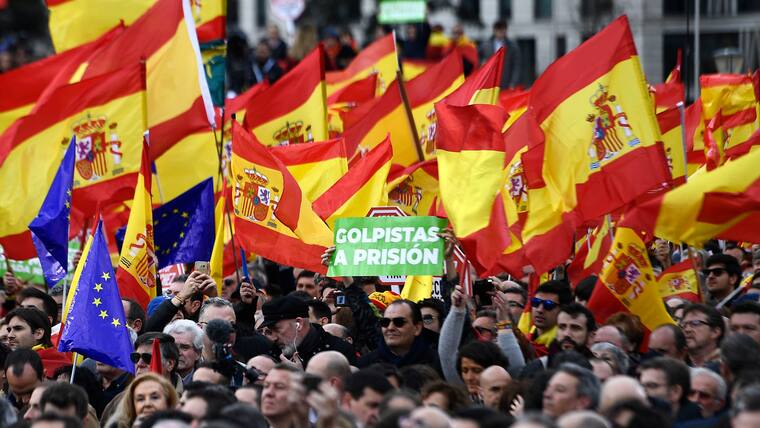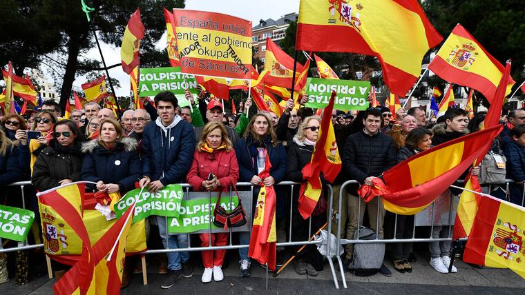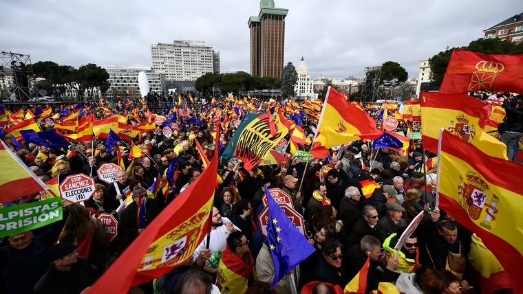 Decenas de miles de personas se manifestaron este domingo en Madrid contra Pedro Sánchez, al que acusan de "traición" a España por dialogar con los separatistas catalanes.