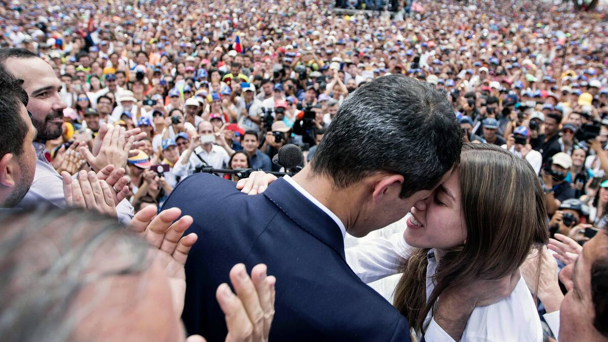 Gritos de júbilo y el cántico '¡Guaidó, Guaidó, Guaidó!' inundaron la plaza Alfredo Sadel, en Caracas, cuando el jefe parlamentario de 35 años apareció en una tarima vestido con blazer y camisa clara junto a su joven esposa.