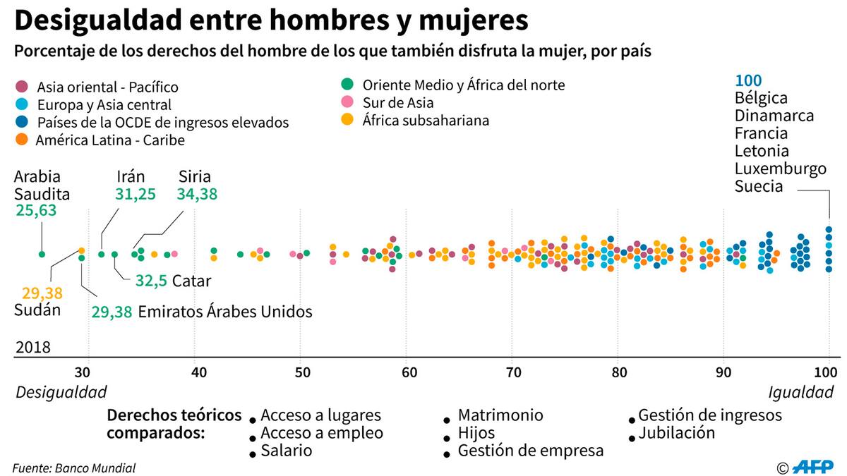 Estos son algunos porcentajes de los derechos del hombre de los que también disfruta la mujer, por país, según un estudio del Banco Mundial. Además, según una selección de indicadores, esta es la participación mundial de la mujer en el ámbito deportivo, laboral, artístico, entre otros.
