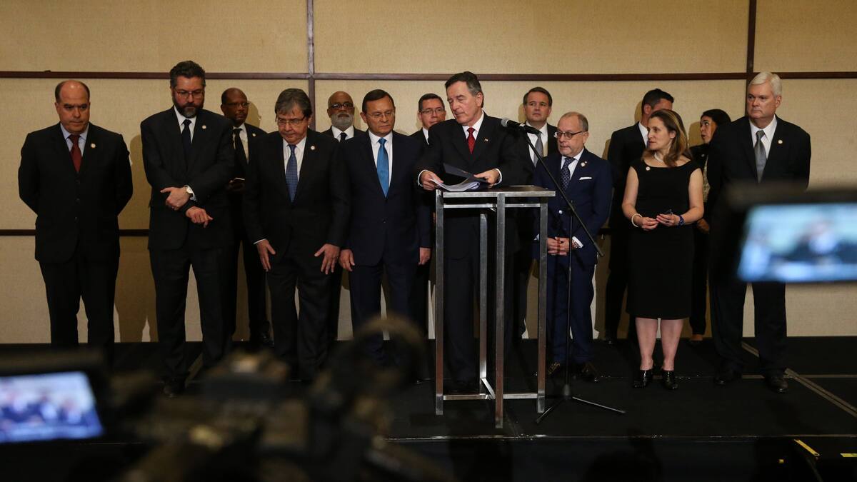 El Grupo de Lima está conformado por los cancilleres de Argentina, Brasil, Canadá, Chile, Colombia, Costa Rica y Perú. Como testigos del hecho estuvieron de garantes los cancilleres de Honduras, Panamá, los embajadores de Guatemala y Paraguay, además del representante del gobierno de Venezuela de Juan Guaidó, Julio Borges.