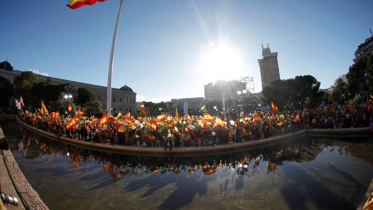 Miles de personas se congregaron el viernes en la Plaza de Colón de Madrid bajo la enorme bandera española que ondea en este lugar emblemático de la capital. Tras varios días de lluvia, el sol brillaba para el mitin de cierre de campaña de Vox, el partido de ultraderecha cuyo auge es la gran novedad de estos comicios. Todos los sondeos presagian que con Vox habrá por primera vez un partido de la extrema derecha en el Congreso de los Diputados desde la transición a la democracia hace 40 años. La formación apela a un nacionalismo exaltado que es en buena parte reacción al nacionalismo separatista en Cataluña. 'Vosotros habéis despertado el alma dormida de España', dijo el líder de Vox, Santiago Abascal, a sus seguidores que respondían con cánticos como 'yo soy español, español, español'.