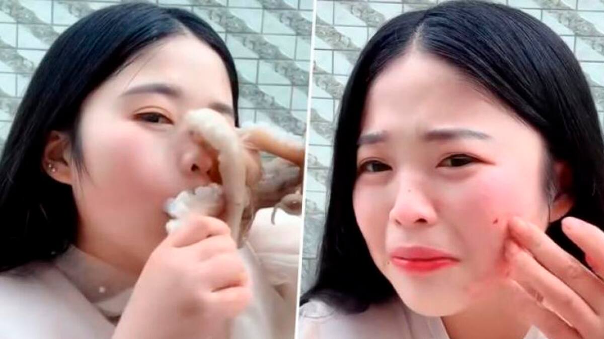 Miles de personas a través de una transmisión en vivo ,fueron testigos del momento en el que un pulpo vivo se pega al rostro de la youtuber china mientas esta intentaba comérselo.