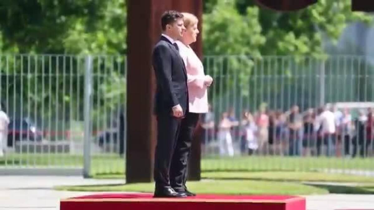 Angela Merkel sufrió temblores durante varios minutos en una ceremonia oficial junto al nuevo presidente ucraniano Volodimir Zelenski, este martes en Berlín,