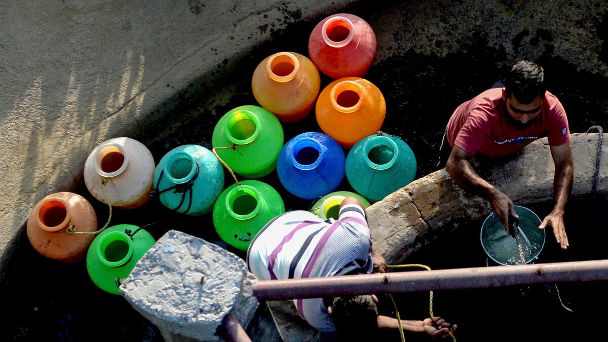 En medio de un chirrido de poleas y de salpicaduras, la gente tira lo más rápido que puede del fondo de los pozos los bidones con el preciado líquido.